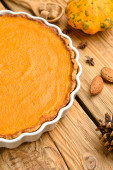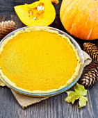 Naczynie do pieczenia z smacznym plackiem dyniowym i świeżym warzywem na czarnym tle, zbliżenie