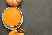 Naczynie do pieczenia z smacznym plackiem dyniowym na białym tle, zbliżenie