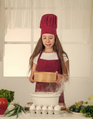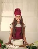 dziewczyna dzieciak w kuchni fartuch i kapelusz gotowanie, brunch
