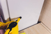Piękna młoda gospodyni domowa w robocze ubrania mycie okien przez profesjonalne narzędzia w domu.