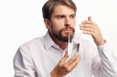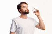 mężczyzna w białej koszulce pitnej wody odizolowane tło