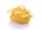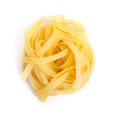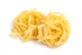 Fettuccine surowy makaron włoski jedzenie izolowane na białym tle. Makaron tagliatelle w kolorze białym