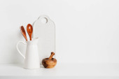 Zdjęcie "Jesienne naczynia i przybory kuchenne motyw i wystrój na drewnianej półce lub lady. Baner na białym tle ściany z przestrzenią do kopiowania. Jesienna kuchnia domu koncepcji gotowania." może być wykorzystywane do celów osobistych i komercyjnych zgodnie z warunkami zakupionej licencji Royalty-free. Obraz jest dostępny do pobrania w jakości wysokiej rozdzielczości do 5760x3840.