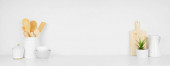 Jesienne naczynia i przybory kuchenne motyw i wystrój na drewnianej półce lub lady. Baner na białym tle ściany z przestrzenią do kopiowania. Jesienna kuchnia domu koncepcji gotowania.