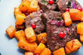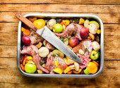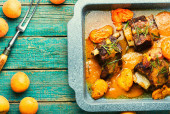 Pyszne żeberka wołowe pieczone w śliwkach i gruszkach.Żeberka mięsne w owocach