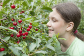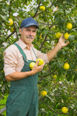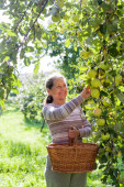 uśmiechający się starsza kobieta w ogrodzie z jabłkami