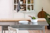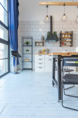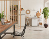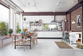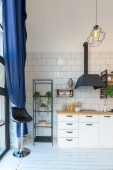 Nowoczesna kuchnia w stylu wnętrz, zmywarka do naczyń stołowych, pralka, lodówka, naczynia kuchenne, krzesło i zlewozmywak, dekoracyjny design lampy.