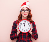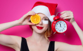 piękna brunetka dziewczynka w Boże Narodzenie kapelusz z ogromny zegar na viola da gamba