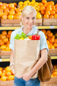 młoda kobieta z torbą na zakupy z zakupami w supermarkecie