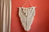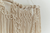 Piękne boho macrame na panelu ściennym. gobelin w stylu Boho wykonany z nici bawełnianych w naturalnym kolorze przy użyciu techniki makramy do dekoracji wnętrz i dekoracji ślubnej. jasne pastelowe kolory
