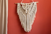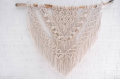 Zdjęcie "Piękne boho macrame na panelu ściennym. gobelin w stylu Boho wykonany z nici bawełnianych w naturalnym kolorze przy użyciu techniki makramy do dekoracji wnętrz i dekoracji ślubnej. jasne pastelowe kolory" może być wykorzystywane do celów osobistych i komercyjnych zgodnie z warunkami zakupionej licencji Royalty-free. Obraz jest dostępny do pobrania w jakości wysokiej rozdzielczości do 5760x3840.
