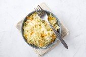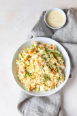 Kolesław. Sałatka z rozdrobnionej białej kapusty, startej marchewki i rabarbaru z pomarańczowym sosem majonezowym w białej misce, jasnobetonowe tło.
