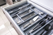 Sztućce stalowe, zastawa stołowa w tacce organizacyjnej w szafce kuchennej, nowoczesny zestaw sztućców.