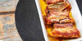 żeberka wieprzowe lub smażona wołowina grill B-B-Q tłuste jedzenie przyprawy pikantna marynata świeża porcja gotowa do jedzenia przekąski posiłek na stole skopiować przestrzeń żywności tło rustykalne. widok z góry