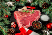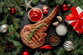 Zdjęcie "grillowane mięso z przyprawami i warzywami na czarnym tle. widok z góry." może być wykorzystywane do celów osobistych i komercyjnych zgodnie z warunkami zakupionej licencji Royalty-free. Obraz jest dostępny do pobrania w jakości wysokiej rozdzielczości do 5760x3840.