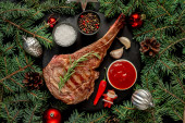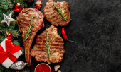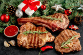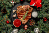 grillowane mięso z przyprawami i warzywami na czarnym tle. widok z góry.