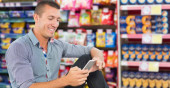Portret uśmiechniętego pracownika w fartuchu w kolorze czarnym stojącego w supermarkecie wśród półek z produktami i pokazującego ekran smartfona w kolorze zielonym.