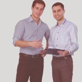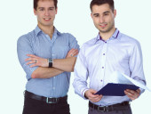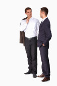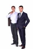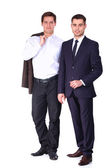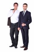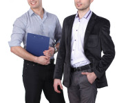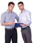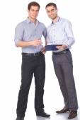 dwóch mężczyzn biznesowych posiadających umowy folderu na białym tle