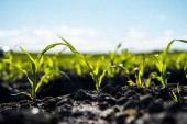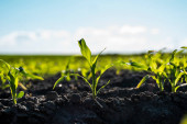 Rzędy kiełków kukurydzy zaczynają rosnąć. Młode sadzonki kukurydzy rosnące w żyznej glebie. Pole uprawne, na którym rośnie młoda kukurydza. Krajobraz wiejski.