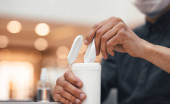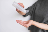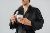 Widok człowieka biorącego krem kosmetyczny ze słoika w łazience