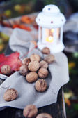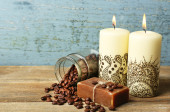 Świece na wzór taca z ziaren kawy i przypraw, guzki na kolor drewniane tła