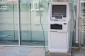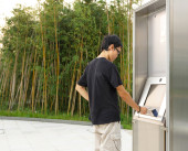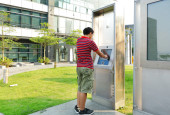 Azji chłopiec gry ekran dotykowy w nowoczesnym budynku poza