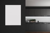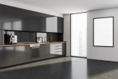 Puste białe płótno na ścianie szarej kuchni z drewnianą podłogą i blatem. Stylowy design z wbudowanymi deatilami i minimalistyczną koncepcją. Szykuj się. 3d renderowanie