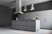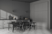 Zdjęcie "Puste białe płótno na ścianie szarej kuchni z drewnianą podłogą i blatem. Stylowy design z wbudowanymi deatilami i minimalistyczną koncepcją. Szykuj się. 3d renderowanie" może być wykorzystywane do celów osobistych i komercyjnych zgodnie z warunkami zakupionej licencji Royalty-free. Obraz jest dostępny do pobrania w jakości wysokiej rozdzielczości do 5760x3840.