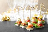 Przekąska na świątecznym stole - kanapki z łososiem, kanapki ze szprotami i krojonym serem i kiełbasą