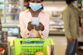 Zdjęcie "Black Lady Zakupy Sklepy przy użyciu telefonu w supermarkecie, Noszenie maski" może być wykorzystywane do celów osobistych i komercyjnych zgodnie z warunkami zakupionej licencji Royalty-free. Obraz jest dostępny do pobrania w jakości wysokiej rozdzielczości do 5760x3840.