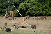 Widok z zewnątrz średniowiecznej drewnianej katapulty w twierdzy