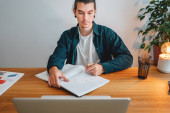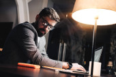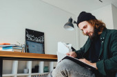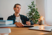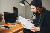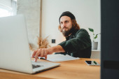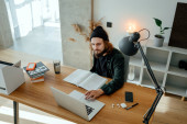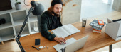 Zdjęcie "Student hipster robi prace domowe podczas studiów na uniwersytecie. Brodaty człowiek robi notatki podczas słuchania wykładu online. Szeroki obraz" może być wykorzystywane do celów osobistych i komercyjnych zgodnie z warunkami zakupionej licencji Royalty-free. Obraz jest dostępny do pobrania w jakości wysokiej rozdzielczości do 5760x3840.