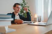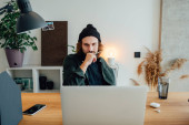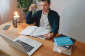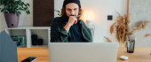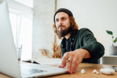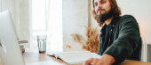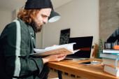 Student hipster robi prace domowe podczas studiów na uniwersytecie. Brodaty człowiek robi notatki podczas słuchania wykładu online. Szeroki obraz