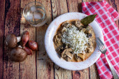 Mielony widok na wykwintny rosół i zupy warzywnej z małym makaronem i pietruszką, wykonane w domu. Służył na zabytkowej płycie na rustykalnym drewnianym stole. Naturalna i zdrowa koncepcja żywności