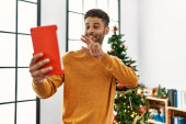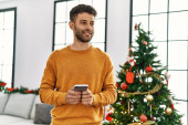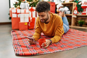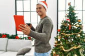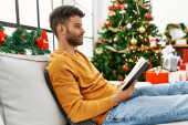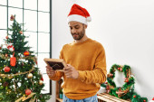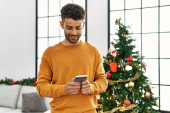 młody arabski człowiek gospodarstwa ramki stojąc przy choince w domu.