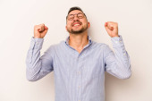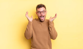 młody przystojny Hiszpan czuje się szczęśliwy, zaskoczony i dumny, krzycząc i świętując sukces z wielkim uśmiechem