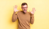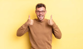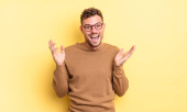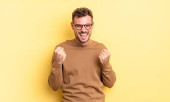 Zdjęcie "młody przystojny Hiszpan czuje się szczęśliwy, zaskoczony i dumny, krzycząc i świętując sukces z wielkim uśmiechem" może być wykorzystywane do celów osobistych i komercyjnych zgodnie z warunkami zakupionej licencji Royalty-free. Obraz jest dostępny do pobrania w jakości wysokiej rozdzielczości do 5760x3840.