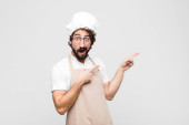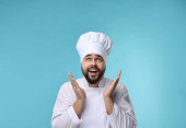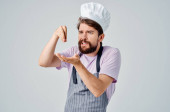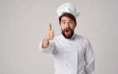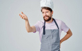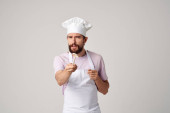 emocjonalny mężczyzna szef kuchni gestykulując dłońmi kuchnia profesjonalna praca