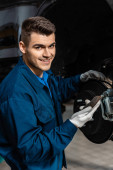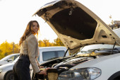 Przycięty widok człowieka samochód kontroli ilości napompowanych opon gumowych samochodu. Ręka z bliska trzymająca oponę i czarny samochód. Pomiar ciśnienia w oponach dla samochodów. Koncepcja przemysłu samochodowego