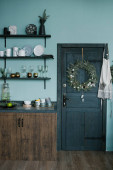 Świąteczny wieniec na drewnianych drzwiach w kuchni w stylu skandynawskim w odcieniach niebieskich