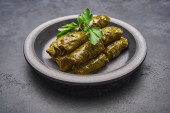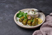 Dolma, nadziewane liście winogron z ryżem, mięsem, śmietaną i cytryną na lekkim talerzu