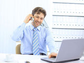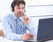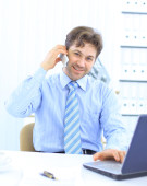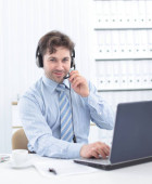 zbliżenie biznesmena z zestawem słuchawkowym. pracuje na laptopie
