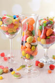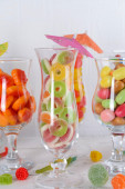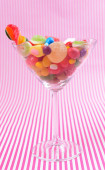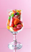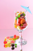 Różne kolorowe cukierki owocowe w szkle na różowym tle