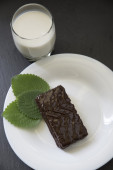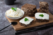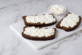 Chleb żytni na desce do krojenia z twarogiem i mlekiem