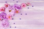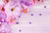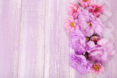 piękne chryzantemy i eustoma sztuczne kwiaty na fioletowym tle drewniane