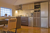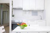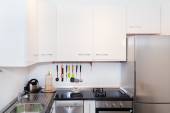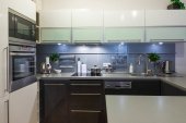 Stylowe wnętrze nowoczesnej kuchni z marmurowym blatem i sprzętem gospodarstwa domowego.