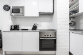 Zdjęcie "Stylowe wnętrze nowoczesnej kuchni z marmurowym blatem i sprzętem gospodarstwa domowego." może być wykorzystywane do celów osobistych i komercyjnych zgodnie z warunkami zakupionej licencji Royalty-free. Obraz jest dostępny do pobrania w jakości wysokiej rozdzielczości do 5760x3840.