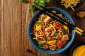 Zdjęcie "Smażony kurczak z mango i mleko kokosowe z makaronem. Przygotowany w woku. Widok góry. Podawany w niebieskiej misce.." może być wykorzystywane do celów osobistych i komercyjnych zgodnie z warunkami zakupionej licencji Royalty-free. Obraz jest dostępny do pobrania w jakości wysokiej rozdzielczości do 5760x3840.