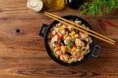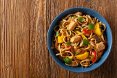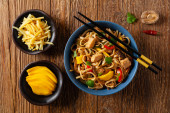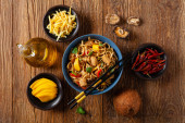Smażony kurczak z mango i mleko kokosowe z makaronem. Przygotowany w woku. Widok góry. Podawany w niebieskiej misce..