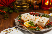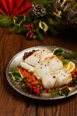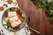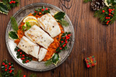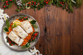 Tradycyjne pierogi z kapustą i grzybami. Świąteczne dekoracje. Widok z góry.